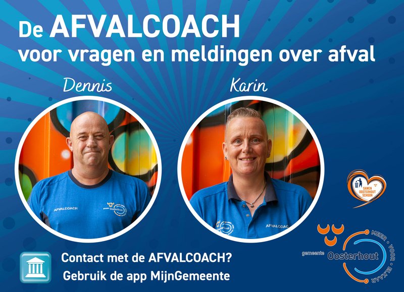 De gemeente Oosterhout heeft twee afvalcoaches in dienst: Karin en Dennis. De afvalcoaches maken inwoners bewuster van afval en afval scheiden. De coaches gaan het gesprek aan met mensen en geven tips en adviezen over het scheiden van afval. Zo zorgen we samen voor een schone stad. Want samen krijgen we meer voor elkaar.