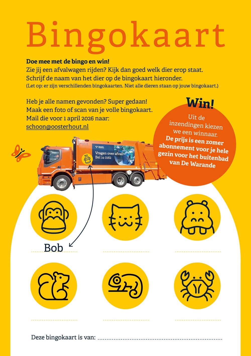 Tijdens de Week van de Afvalhelden organiseren we in Oosterhout een leuke en leerzame activiteit voor kinderen: de Afvalhelden Bingo! Met deze actie ontdekken kinderen op een speelse manier het werk van onze afvalhelden én de voertuigen die dagelijks door onze stad rijden.
